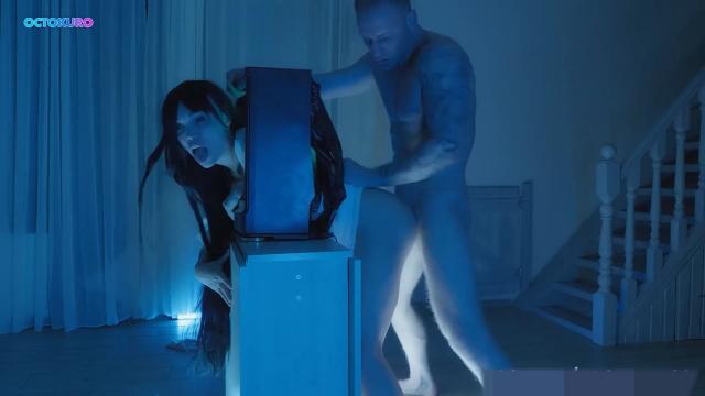 Чудный русский парень так долго смотрел порно фильмы, что ему стали мерещиться разные ужасные секс сцены. Ближе к полуночи из телевизора начала вылазить ведьма с большим сиськами. Видя, что незваная гостя застряла и не может дать отпор, возбужденный чувак выебал ведьму в рот, а потом пристроился сзади. Классно потрахавшись, мужик затолкал бабу в телик и ушел спать.