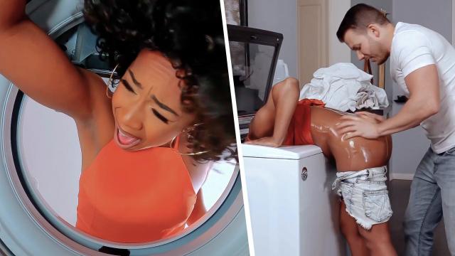 Темнокожая милфа специально сделала вид, что застряла в стиралке, чтобы белокожий парень оценил ее восхитительную задницу в коротких шортах. Дамочка выглядела настолько развратно, что уже на следующий день они вовсю трахались прямо в гостиной. Просто теперь ничего не сдерживало партнеров, которые твердо решили добиться шикарного удовлетворения. Тетка смогла вымотать любовнику своими пожеланиями по поводу постоянной смены поз, а также не возражала против получения семени в жаркий ротик в конце разврата.
